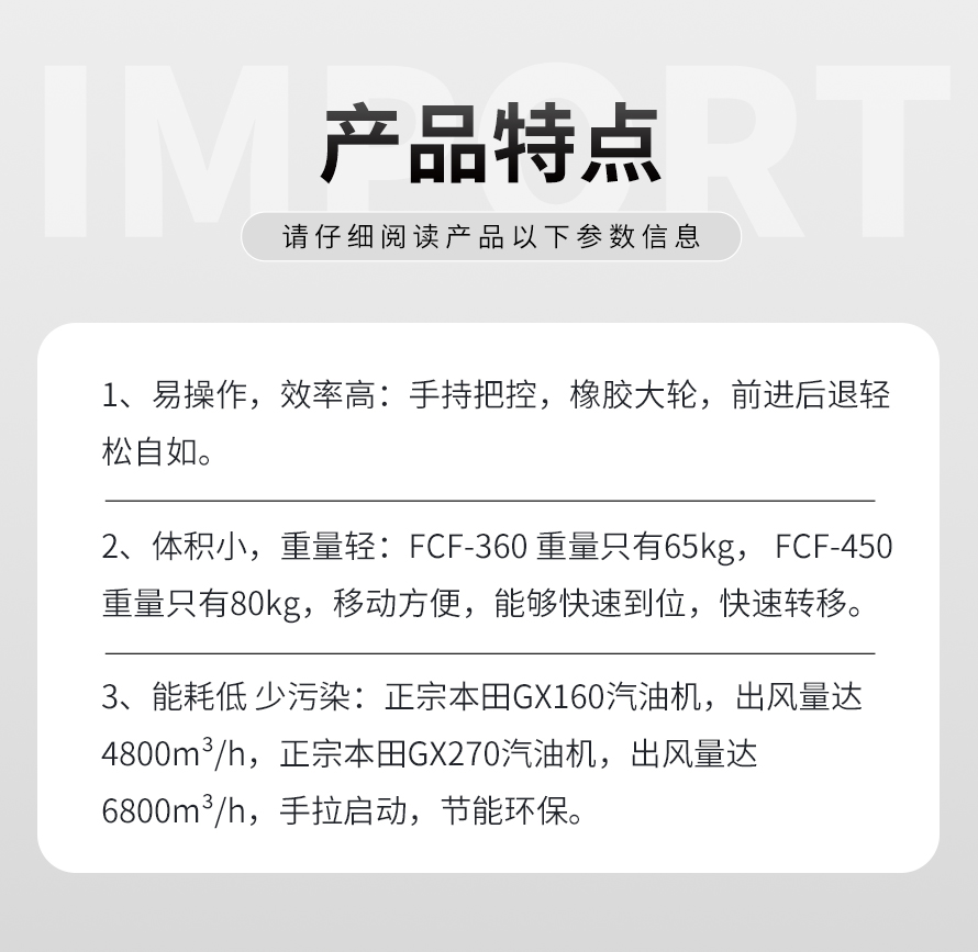 FCF-450路面吹風(fēng)機(jī)采用本田汽油動(dòng)力,性能穩(wěn)定。風(fēng)葉動(dòng)力平衡性強(qiáng),保證整體的穩(wěn)定性。大風(fēng)量,性能優(yōu)越。