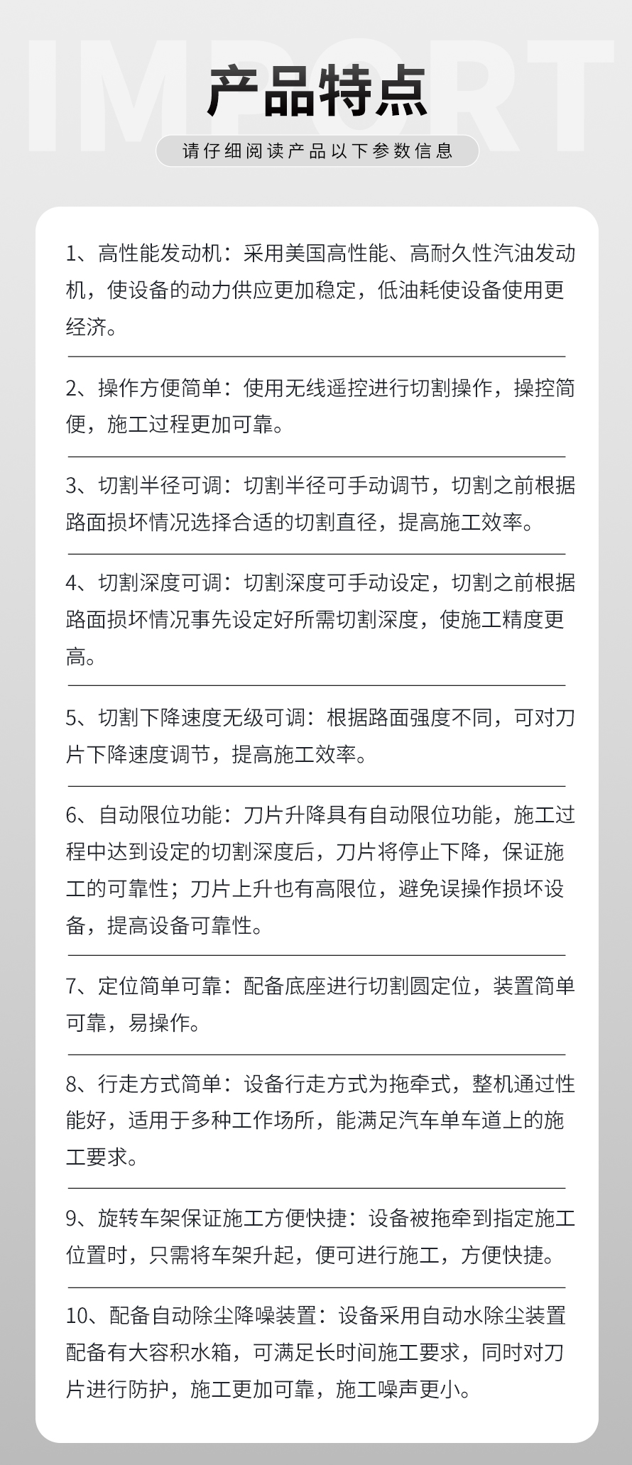 專門用于對城市道路中機動車道等井蓋周圍的水泥混凝土或瀝青路面進行圓形切割。為清楚井蓋周圍的破損路面提供分割區(qū)域,修復(fù)后的地面美觀,延長了路面的使用壽命。